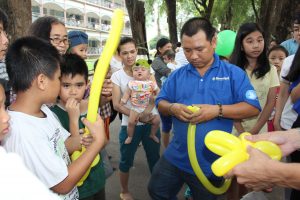 Tình nguyện viên chương trình “Xuân yêu thương” làm bóng nghệ thuật tặng các bé trong chương trình.