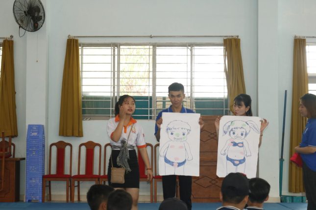Ngoài việc được vui chơi, các em thiếu nhi còn được trang bị kiến thức về “Kỹ năng phòng chống xâm hại” do các bạn đến từ CLB Kỹ năng Công tác xã hội chia sẻ.