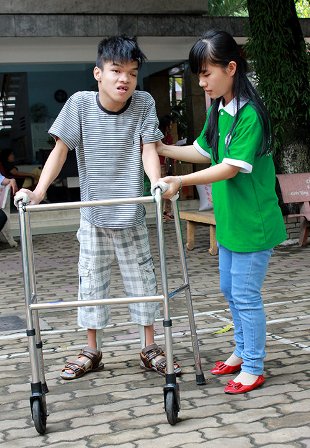 Cẩn thận đỡ từng bước, bạn Hồng Lan (ĐH Khoa học xã hội & nhân văn, ĐHQG TP.HCM) dìu Đức Phú bước thật chậm với gậy tập đi. Phú bị bại não, không phát âm thành lời, teo cơ chân nên mỗi bước đi là cả sự cố gắng. Phú cười suốt vì hôm nay có người cùng tập đi với mình.