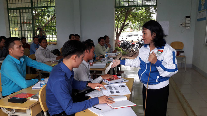 | Chiến sĩ tình nguyện Nguyễn Thị Mai dạy tiếng Việt cho người Lào – Ảnh: QUANG PHƯƠNG |