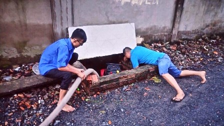 Các bạn đoàn viên, thanh niên khai thông cống rãnh sau mưa kết hợp triều cường. Ảnh: Quận đoàn 12.