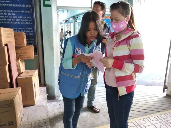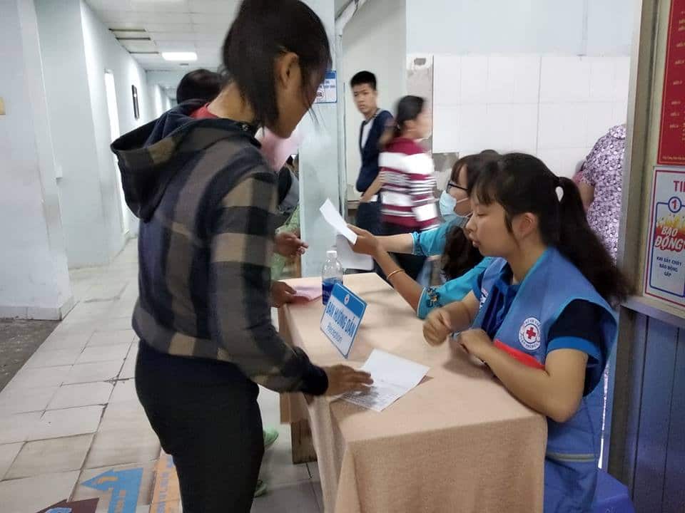 Các bạn tình nguyện viên Đội hình “Tiếp sức người bệnh” đang hỗ trợ hướng dẫn bệnh nhân và thân nhân người bệnh về quy trình khám và điều trình bệnh viện Quận Thủ Đức. Ảnh: Ngọc Linh.