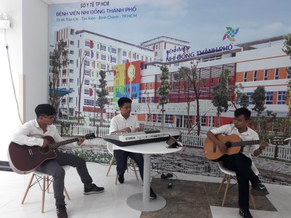 Các bạn tình nguyện viên đánh đàn phụ vụ cho các bệnh nhi khi đến khám và điều trị bệnh tại bệnh viện Nhi đồng TP.