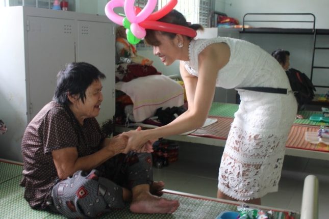 Ca sĩ Lê Trinh tặng bao lì xì cho các cụ tại Trung tâm Bảo trợ xã hội Chánh Phú Hòa. Ảnh: Quốc Bình.