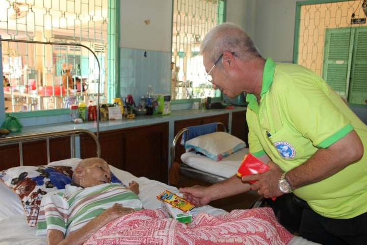 Chú Thái, là tình nguyện viên của chương trình tặng bao lì cho bệnh nhân đang điều trị tại Khu điều trị bệnh phong Bến Sắn. Ảnh: Quốc Bình.