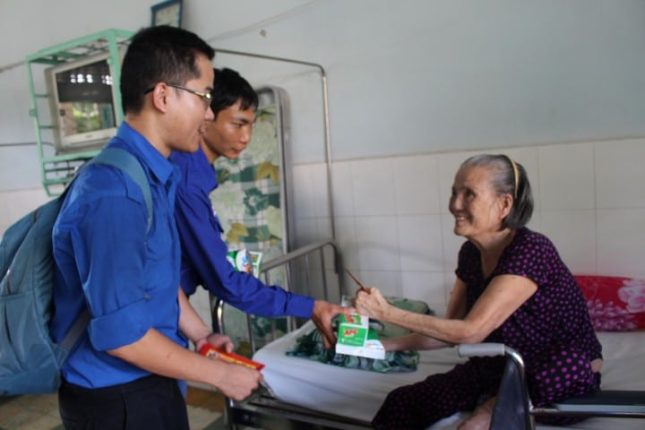 Anh Nguyễn Nhật Phúc, Đội phó Đội Công tác xã hội Thanh niên Thành phố tặng bao lì xì cho các cụ tại Khu điều trị bệnh phong Bến Sắn. Ảnh: Quốc Bình.