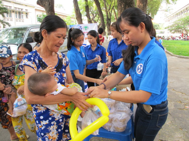 Ngay gần khu sân chơi là nhóm những tình nguyện viên tặng những phần “cháo yêu thương”, sữa, bánh cho bệnh nhi nghèo do Trung tâm Công tác xã hội thanh niên TP (Thành đoàn TP.HCM) phối hợp bệnh viện tổ chức. Chương trình này được thực hiện tại Bệnh viện Nhi Đồng 2 vào sáng chủ nhật và Bệnh viện Bệnh nhiệt đới vào thứ năm hằng tuần.