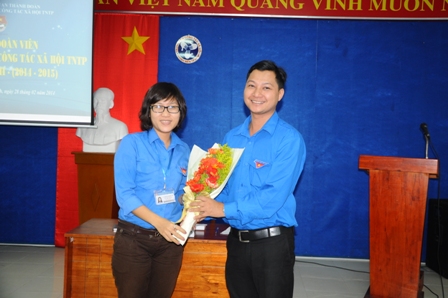Đồng chí Trần Thanh Truyền (bìa phải) – UV. BCH Đoàn Cơ quan Thành Đoàn tặng hoa chúc mừng đoàn đại biểu tham dự đại hội đại biểu cấp trên.