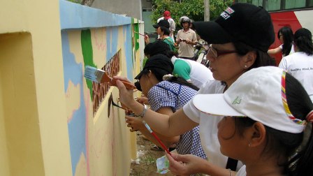 Các tình nguyện viên một công ty sơn tại TP.HCM tham gia sơn, vẽ trang trí tường trước cổng trường mẫu giáo tại huyện Hóc Môn (TP.HCM) do Trung tâm Công tác xã hội thanh niên TP.HCM làm cầu nối – Ảnh: Q.L.