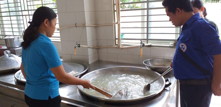 Đội viên Đội Công tác xã hội Thanh niên TP. cùng nhân viên nhà bếp tại Trung tâm Bảo trợ người tàn tật Hiệp Bình Chánh nấu nước dùng bánh canh cho học viên của Trung tâm.