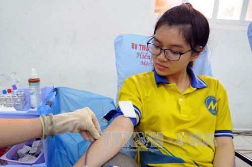 Sinh viên tình nguyện tham gia hiến máu. Ảnh: TTXVN