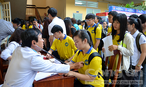 Các bạn tình nguyện viên được kiểm tra sức khỏe trước khi hiến máu. – Ảnh: Báo Công an Thành phố
