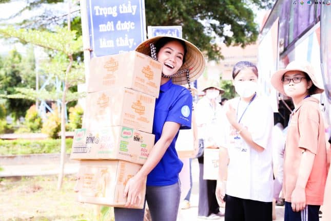 Hoa hậu H’Hen Niê cùng các bạn tình nguyện viên chuẩn bị quà tặng trong chương trình.