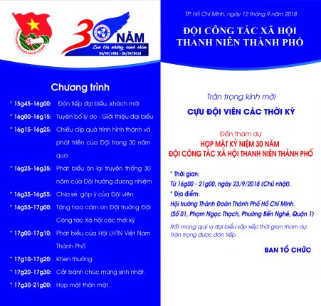 Trân trọng kính mời các anh/ chị Nguyên Đội Trưởng, Đội Phó, Ban Điều hành, Đội viên Đội Công tác xã hội Thanh niên Thành phố qua các thời kỳ