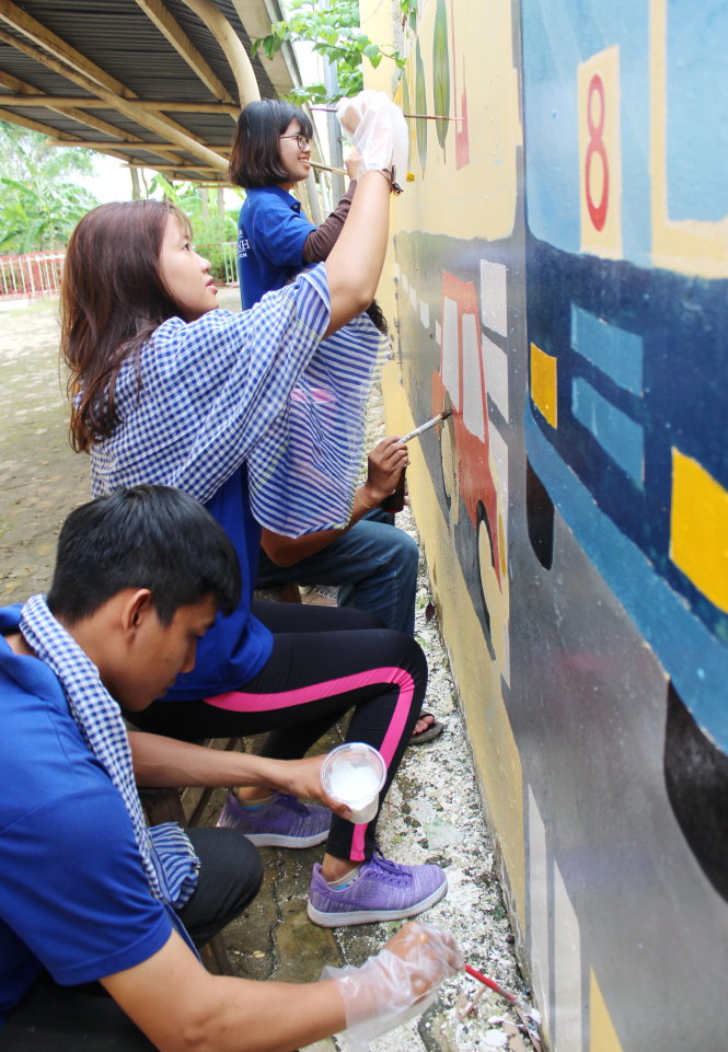 Tại cơ sở 2 Trường THPT chuyên Trần Đại Nghĩa (Q.2, TP.HCM), 17 thành viên đội hình của Trường CĐ Sư phạm trung ương TP.HCM cũng gấp rút hoàn thành các bức tranh bao quanh tường phòng nghỉ dành cho học sinh bán trú để kịp qua công trình khác.