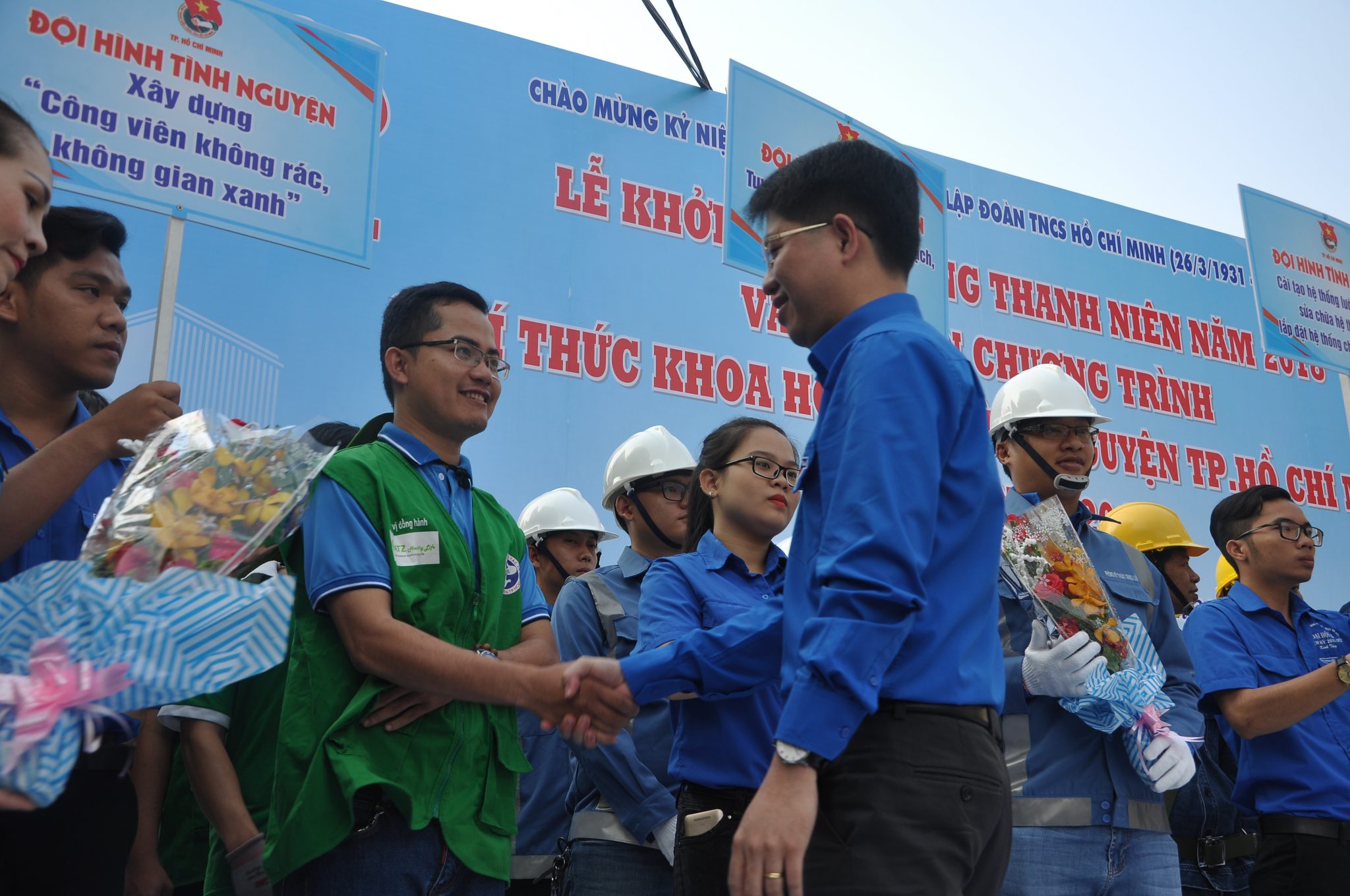 Anh Phạm Hồng Sơn – Bí thư Thành Đoàn, Chủ tịch Hội Liên hiệp Thanh niên Việt Nam TP. Hồ Chí Minh tặng hoa cho các đội hình tình nguyện trong lễ khởi động Tháng Thanh niên năm 2018.