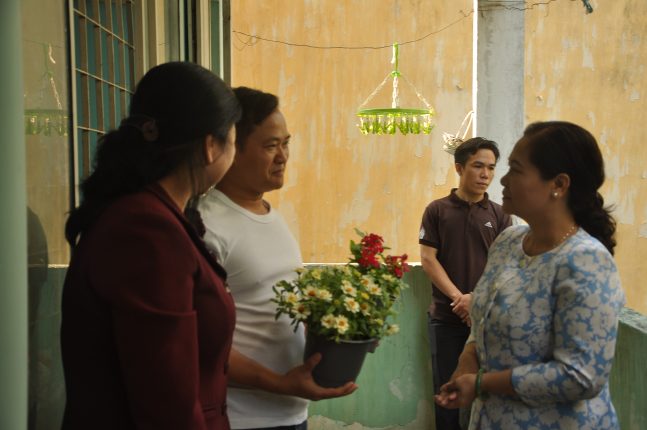 Lãnh đạo Ban Dân vận Thành ủy tặng hoa tại cho các hộ dân tại khu chung cư Nguyễn Văn Lượng, quận Gò Vấp.