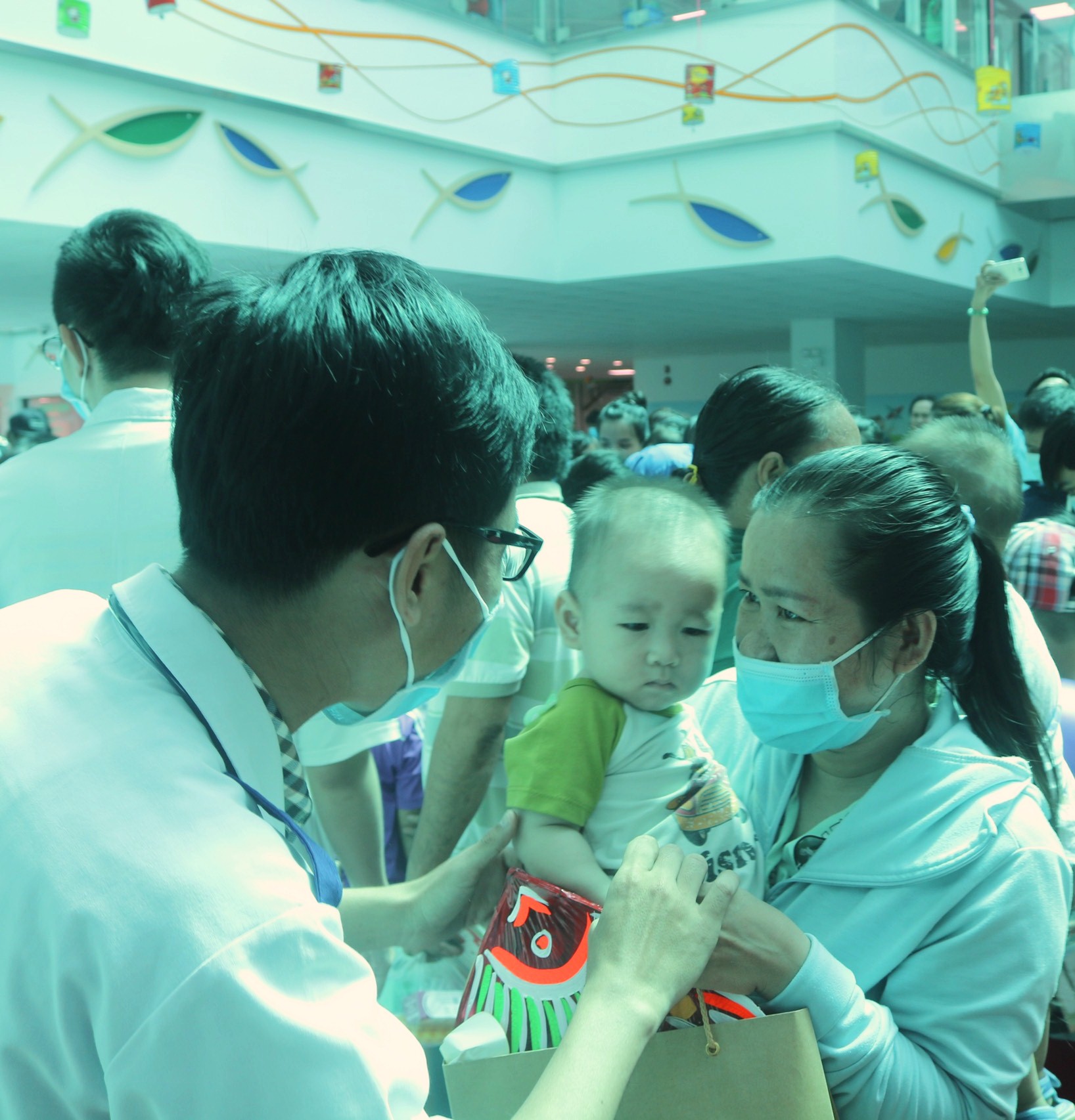 Đồng chí Dương Ngọc Tuấn – Giám đốc Trung tâm Công tác Xã hội Thanh niên Thành phố cùng đại diện Bệnh viện Nhi đồng Thành phố và các nghệ sĩ Ngôi sao Phương Nam, nhóm Mộc, các mạnh thường quân trao quà trung thu cho cặp song sinh đã được tách rời Diệu Nhi – Trúc Nhi.