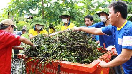 Dọn rác khơi thông kênh rạch được coi là công trình trọng điểm trong các hoạt động của năm tình nguyện 2014 tại TP.HCM – Ảnh: Q.L.