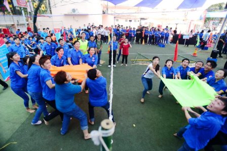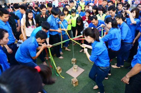 Trò chơi “Sức mạnh chi đoàn” thu hút động đảo đoàn viên, thanh niên tham gia sau lễ khai mạc Ngày đoàn viên sáng 22-3 tại Nhà văn hóa Thanh niên, Q.1, TP.HCM – Ảnh: Quang Định