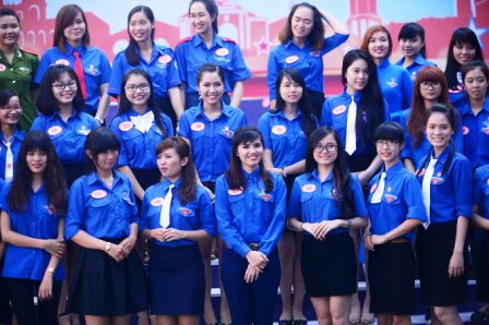 Các bạn nữ đoàn viên, thanh niên xinh tươi trong trang phục áo đoàn tham gia hội thi “Nét đẹp đoàn viên” sau lễ khai mạc Ngày đoàn viên sáng 22-3 tại Nhà văn hóa Thanh niên, Q.1, TP.HCM – Ảnh: Quang Định