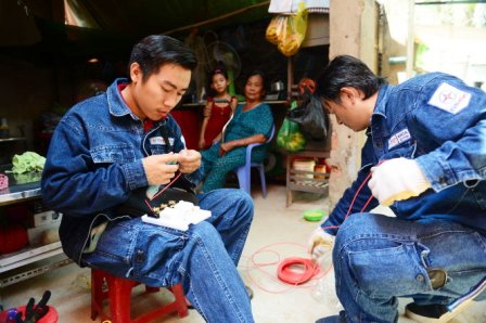Đoàn Tổng công ty Điện lực TP.HCM sữa chữa điện cho các hộ gia đình khó khăn, chính sách trên địa bàn Q.7, TP.HCM – Ảnh: Quang Định