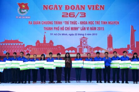 Trao 50 suất học bổng khóa đào tạo “Lãnh đạo khởi nghiệp” với giá trị 5 triệu đồng/suất cho các bạn đoàn viên, thanh niên trong lễ khai mạc Ngày đoàn viên sáng 22-3 tại Nhà văn hóa Thanh niên, Q.1, TP.HCM – Ảnh: Quang Định