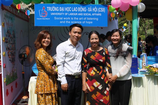 Gian hàng trưng bày và giới thiệu của Khoa Công tác xã hội Trường Đại học Lao động xã hội (Cơ sở II) trong ngày hội.