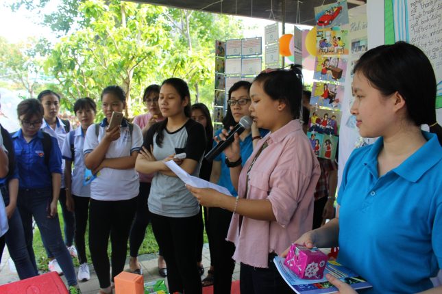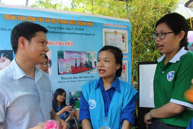 Các bạn tình nguyện viên giới thiệu các hoạt động của Trung tâm Công tác xã hội Thanh niên Thành phố.