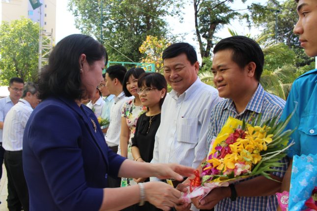 Bà Nguyễn Thị Liên, Phó Giám đốc Sở Lao động – Thương binh và Xã hội Thành phố trao hoa chúc mừng các đơn vị đạt giải trong hội thi.