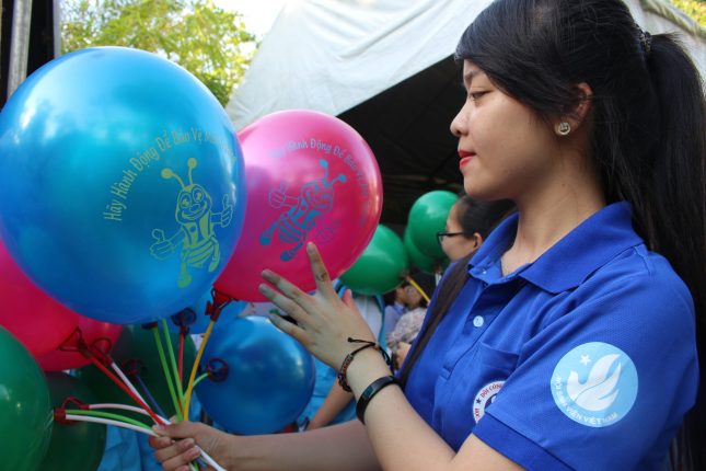 Các bạn tình nguyện viên thích thú với bong bóng của Đội hình Công viên không rác.