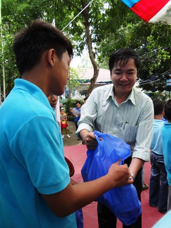 Anh Trần Bá Cường – Giám đốc Trung tâm Công tác xã hội Thanh niên Thành phố trao tặng quà cho các em thiếu nhi tại ngày hội.