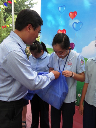 Anh Lê Quốc Phong – UVTV Trung ương Đoàn, Bí thư Thành đoàn, Chủ tịch Hội LHTN Việt Nam TP. HCM trao tặng quà cho các em thiếu nhi có hoàn cảnh đặc biệt tại ngày hội.