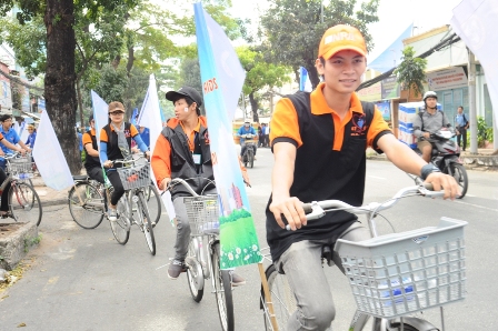 Các bạn tình nguyện viên tham gia đạp xe diễu hành tuyên truyền bảo vệ môi trường.