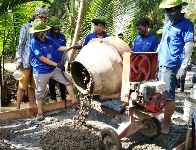 | Chiến sĩ ĐH Bách khoa tham gia bêtông hóa đường nông thôn tại huyện Chợ Lách (Bến Tre) trong Mùa hè xanh 2017 – Ảnh: Q.NG. |