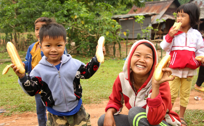Chỉ sau 15 phút, hơn 100 ổ bánh mì đã phát xong. Trên đường làng, những đứa trẻ lưng đeo cặp, tay cầm ổ bánh mì vừa đi vừa gặm vừa nói chuyện râm ran.