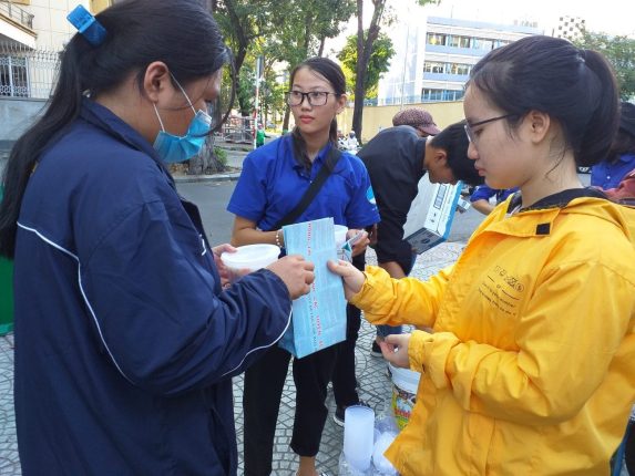 Các bạn tình nguyện viên trao “Suất ăn nghĩa tình” đến với người nhà bệnh nhân tại bệnh viện Nhi Đồng 2.