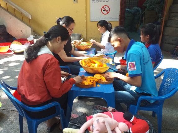 Hơn 20 bạn tình nguyện viên đã có mặt từ sáng sớm, mỗi người một việc, cùng nhau làm hết sức vui vẻ từ khâu chuẩn bị dụng cụ, sơ chế nguyên liệu, chế biến thành phẩm và mang đến cho bệnh nhân. Với phương châm “Mỗi suất ăn là một niềm vui”, các bạn tình nguyện viên đã chọn những nguyên liệu thực phẩm sạch, có xuất xứ rõ ràng, trong quá trình chế biến, vấn đề vệ sinh an toàn thực phẩm cũng được quan tâm hàng đầu. Ngoài việc đảm bảo an toàn vệ sinh thực phẩm, công tác giữ gìn vệ sinh môi trường cũng được quan tâm, các hộp đựng cháo được làm 100% từ bã mía, còn các túi đựng sữa cũng được các bạn làm từ giấy thân thiện với môi trường, không sử dụng túi ni long hay hộp nhựa dùng 01 lần để bảo vệ môi trường, đảm bảo sức khỏe người bệnh.