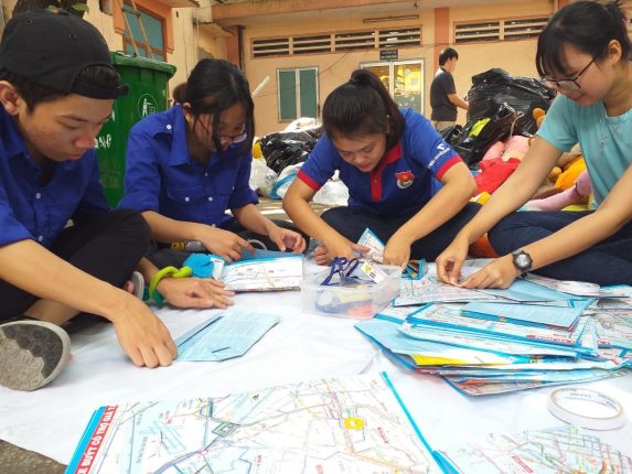 Túi giấy được các bạn tự gấp để thay thế túi ni long phục vụ cho việc tặng quà kèm theo “Suất ăn nghĩa tình”.