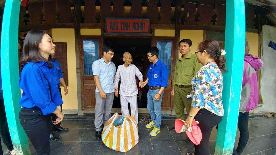 Anh Tống Hoàng Quân – Đội trưởng Đội Công tác xã hội Thanh niên Thành phố (áo màu xanh, đứng thứ 3 từ trái qua) trao quà cho Mẹ Việt Nam anh hùng Nguyễn Thị Lệ tại xã Sơn Thủy, huyện A Lưới, tỉnh Thừa Thiên Huế.