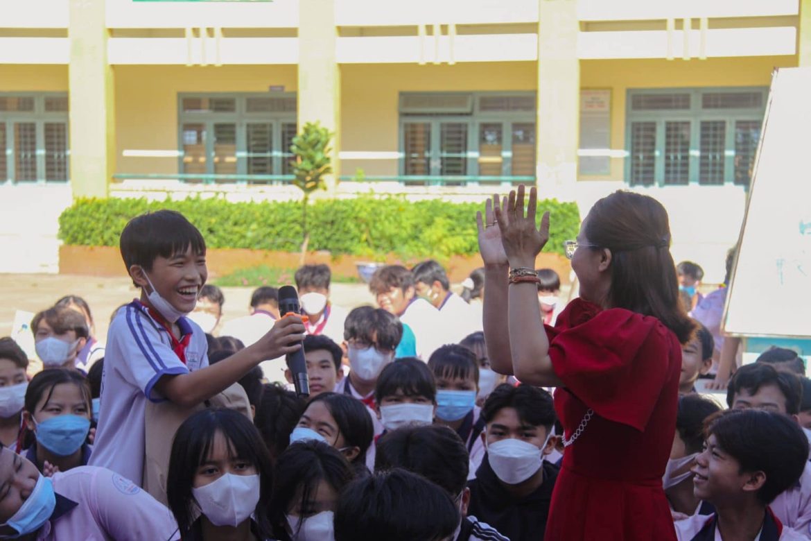 Học sinh tích cực tham gia trả lời các câu hỏi đến giảng viên về các kỹ năng phòng chống xâm hại để nhận quà.