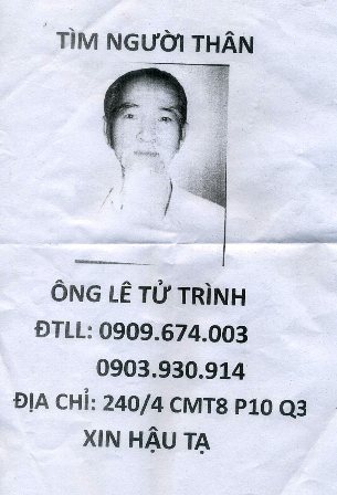 Ai thấy ông Lê Tử Trình ở đâu, xin vui lòng báo tin về địa chỉ: 240/4 đường Cách Mạng Tháng 8, phường 10, quận 3 hoặc điện thoại số 0909.674.003 và 0903.930914