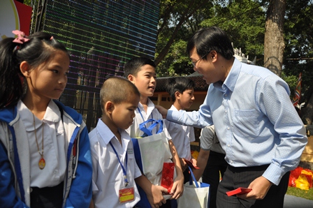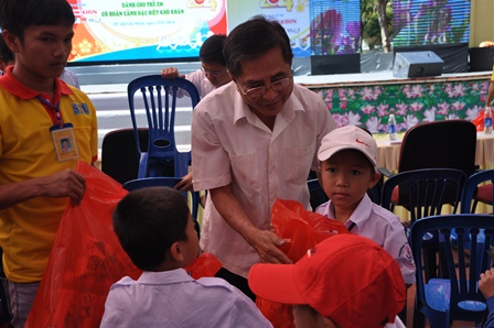 Ông Nguyễn Văn Rảnh – Ủy viên Thường vụ, Trưởng ban Dân vận Thành uỷ tặng quà tết cho các em thiếu nhi.