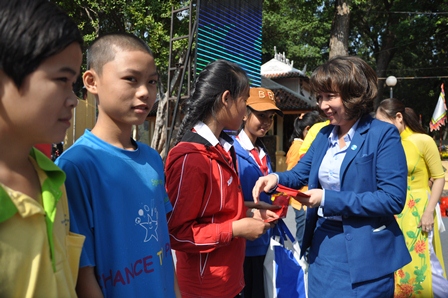 Bà Đỗ Nguyễn Ái Khanh – Giám đốc Marketting ngân hàng CPTM Xuất nhập khẩu Việt Nam (Eximbank) lì xì các em thiếu nhi trong dịp xuân mới.