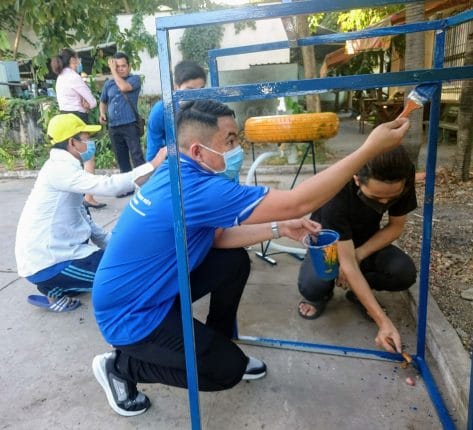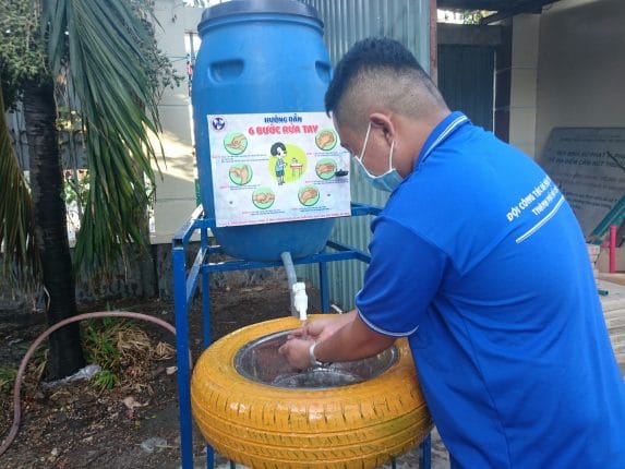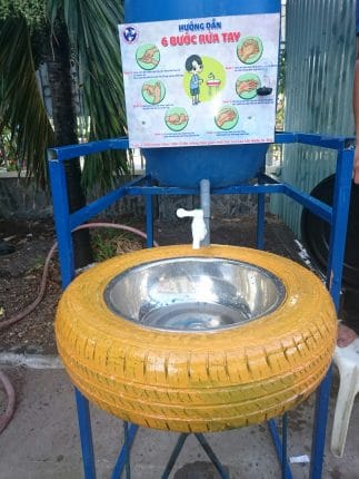 Song song với việc may và tặng khẩu trang vải miễn phí, Trung tâm còn thực hiện xây dựng và trao tặng bồn rửa tay từ vật liệu tái chế. Bồn rửa tay từ vật liệu tái chế đầu tiên đã được Trung tâm thực hiện tại Quận Bình Tân.