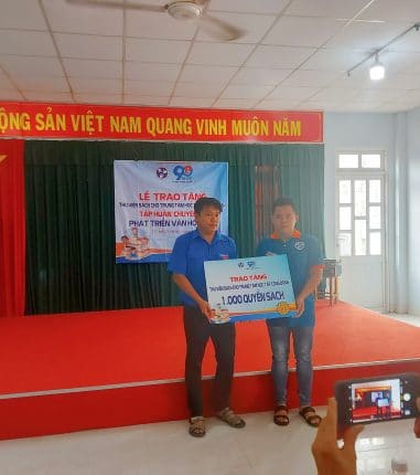 Anh Võ Quốc Bình – Trưởng phòng Kết nối tình nguyện (Trung tâm Công tác xã hội Thanh niên Thành phố) trao bảng tượng trưng 1.000 quyển sách cho Trung tâm học tập Cộng đồng phường Hiệp Thành, quận 12.