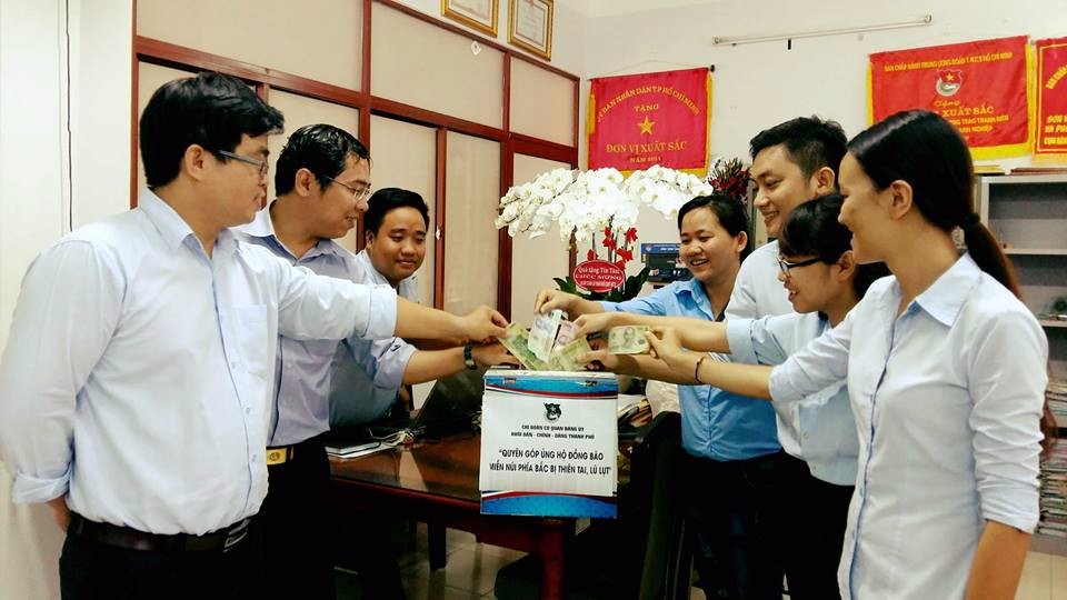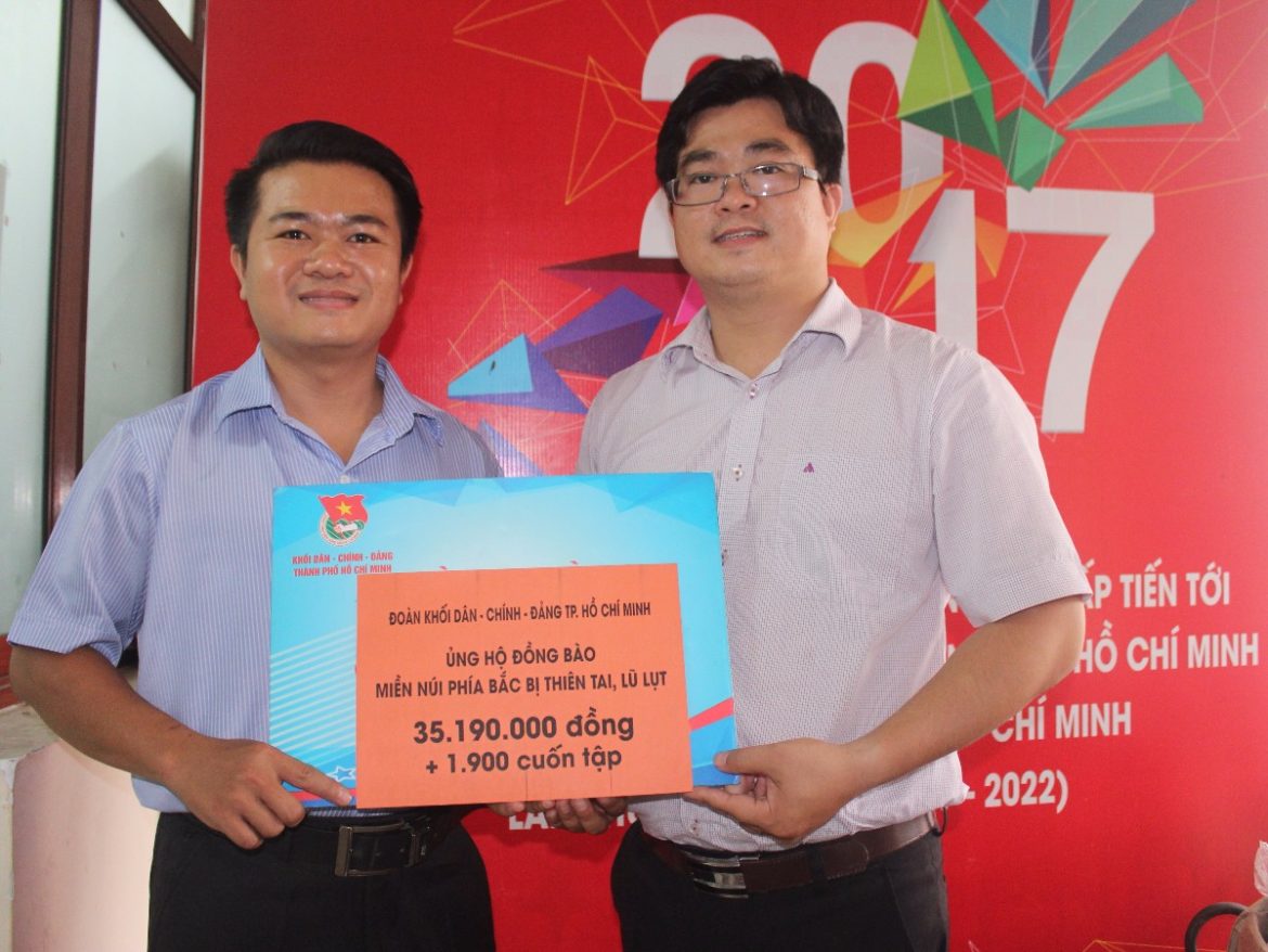 Để chung tay xoa dịu những nỗi mất mát đó, với truyền thống “Tương thân tương ái, lá lành đùm lá rách”, hưởng ứng lời kêu gọi của Trung ương Đoàn TNCS Hồ Chí Minh và Thành Đoàn Thành phố Hồ Chí Minh cùng đồng bào cả nước, từ ngày 13-15/8/2017 Đoàn Khối Dân – Chính – Đảng Thành phố đã mở cuộc vận động trong đoàn viên, thanh niên Khối chung tay góp sức chia sẻ cùng nhân dân vùng mưa lũ vượt qua những khó khăn và mất mát, sớm ổn định cuộc sống. Ngay sau lời kêu gọi, phát động của Đoàn Khối, các cơ sở Đoàn trực thuộc đã phát động trong đoàn viên thanh niên và bản thân các đồng chí cán bộ Đoàn đã thực hiện quyên góp ủng hộ đồng bào các tỉnh Tây Bắc bị thiệt hại do mưa lũ. Qua 3 ngày phát động công tác quyên góp đã nhận được sự ủng hộ nhiệt tình của đoàn viên thanh niên Khối với số tiền: 35.190.000 đồng và 1.900 cuốn tập trắng cùng nhiều nhu yếu, quần áo cũ…