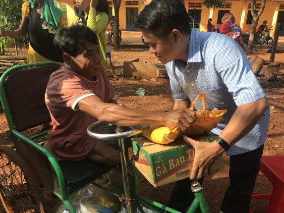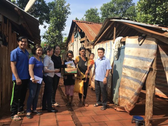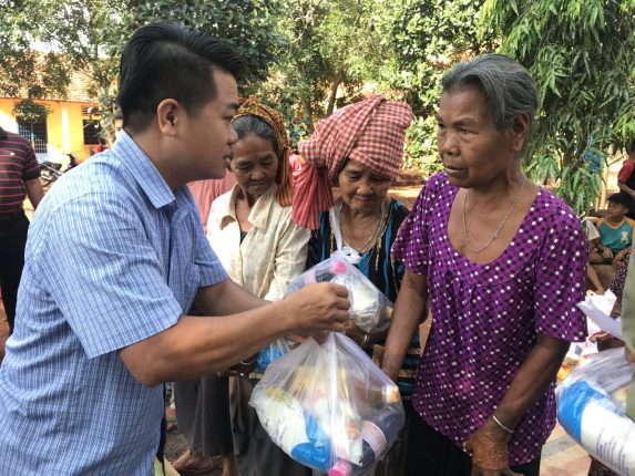 Anh Huỳnh Thanh Nhã – Phó Giám đốc Trung tâm Công tác xã hội Thanh niên Thành phố trao quà tặng đồng bào dân tộc Stiêng tại các hộ dân.